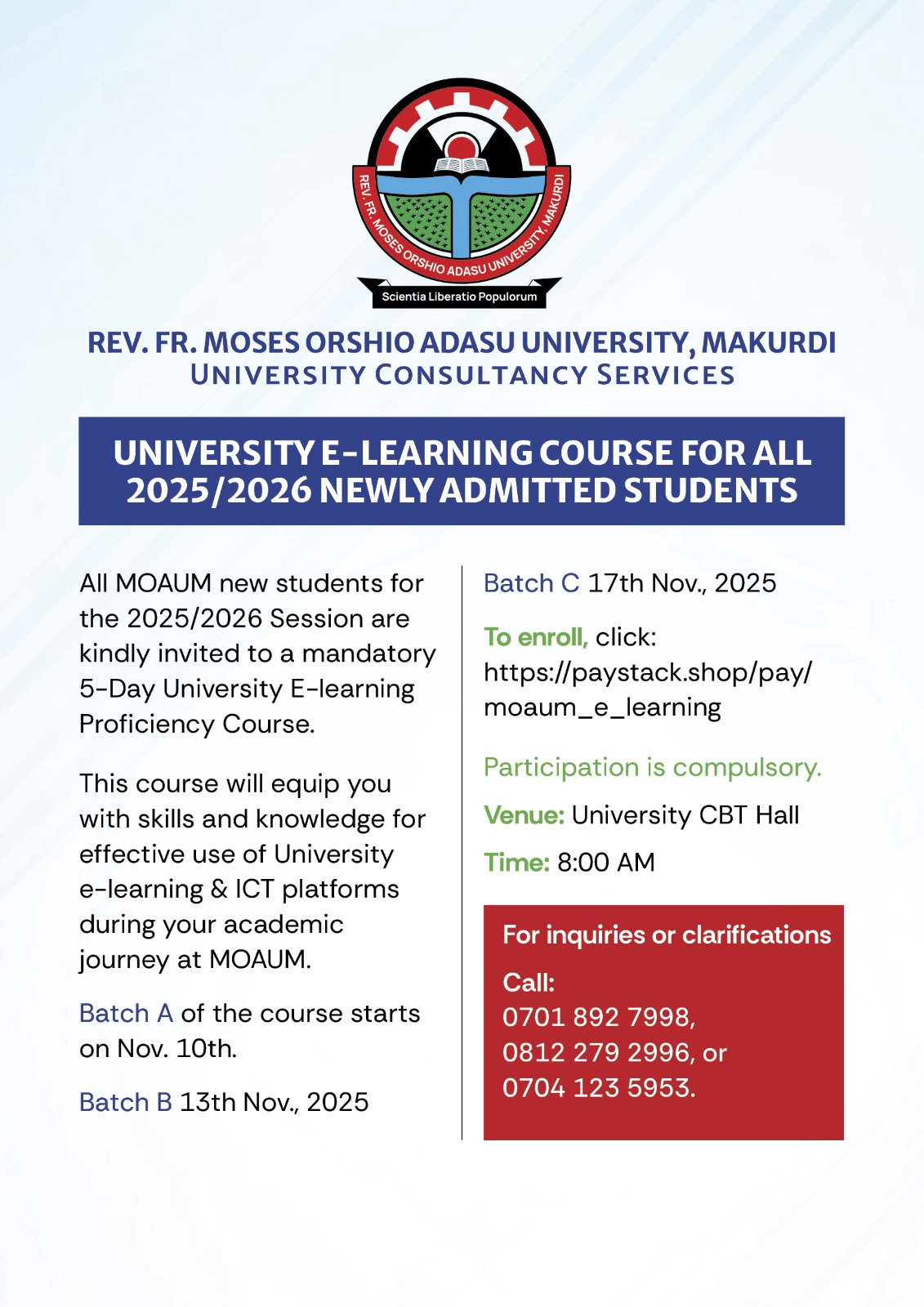 ATTENTION: All MOAUM new students for the 2025/2026 Session are kindly invited to a mandatory 5-Day University E-learning Proficiency Course.